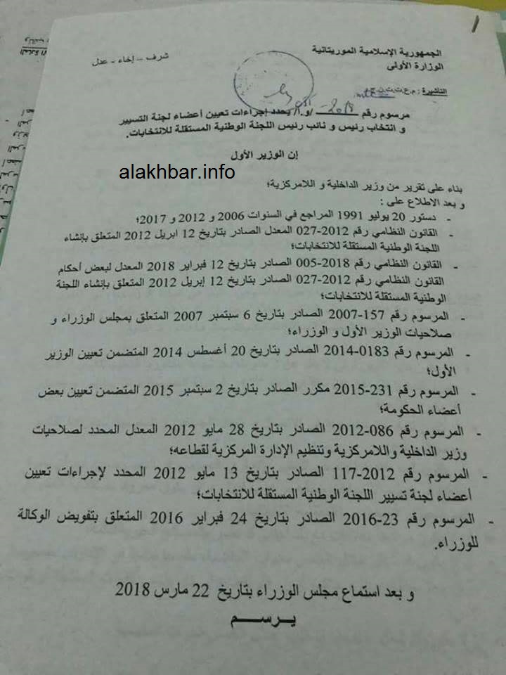 الأخبار (نواكشوط) - حصلت الأخبار على نص المرسوم المحدد لتعيين أعضاء لجنة التسيير وانتخاب رئيس ونائب رئيس اللجنة الوطنية المستقلة للانتخابات.
