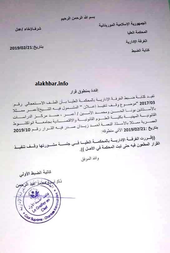الأخبار (نواكشوط) ـ أوقفت الغرفة الإدارية بالمحكمة العليا إجراءات التحضير لمسابقة اكتتاب للحصول على شهادة الكفاءة لممارسة مهنة المحاماة، وذلك بعد طعون تقدم بها ضحايا الشروط الواردة في إعلان هذه المسابقة.