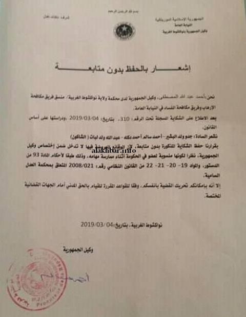 ووقع الشكوى كل من: جدو ولد البشير، أحمد سالم ولد أحمد دكله، وعبد الله ولد ابات.