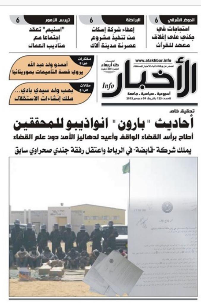 الأخبار (نواكشوط) نشرت صحيفة الأخبار إنفو في عددها الصادر الأربعاء: 09 ديسمبر 2015م تحقيقا مطولا حول ملابسات التحقيق مع رجل الأعمال الحاج أحمد ولد إبراهيم المولود سنة 01 – 01 – 1976 في كيدال بشمال المالي، بعج القبض عليه يوم 06 مارس 2015 من قبل فرقة من الدرك الموريتاني.