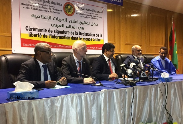 الأخبار (نواكشوط) ـ وقع وزير الثقافة الناطق الرسمي باسم الحكومة الموريتانية سيدي محمد ولد محم اليوم الجمعة 31 مايو 2019 إعلان الحريات الإعلامية في العالم العربي، رفقة رئيس الاتحاد الدولي للصحفيين فيليب افرانسوا.
