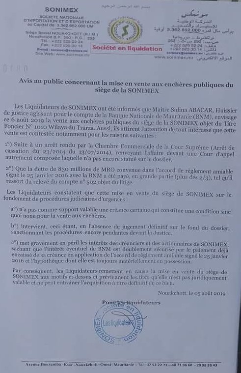 الأخبار (نواكشوط) ـ أعلنت اللجنة المكلفة بتصفية الشركة الموريتانية للإيراد والتصدير "سونمكس" عن مناقصة لبيع مقر الشركة مفتوحة أمام العموم.