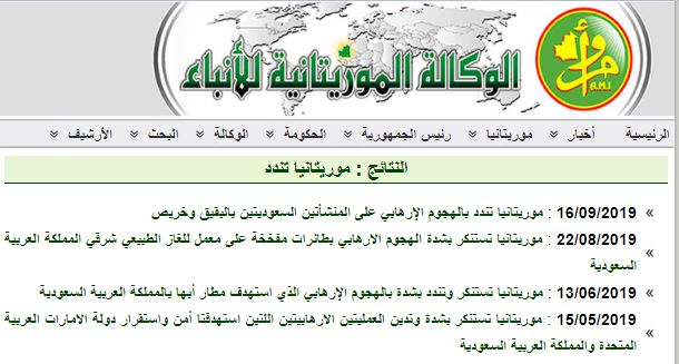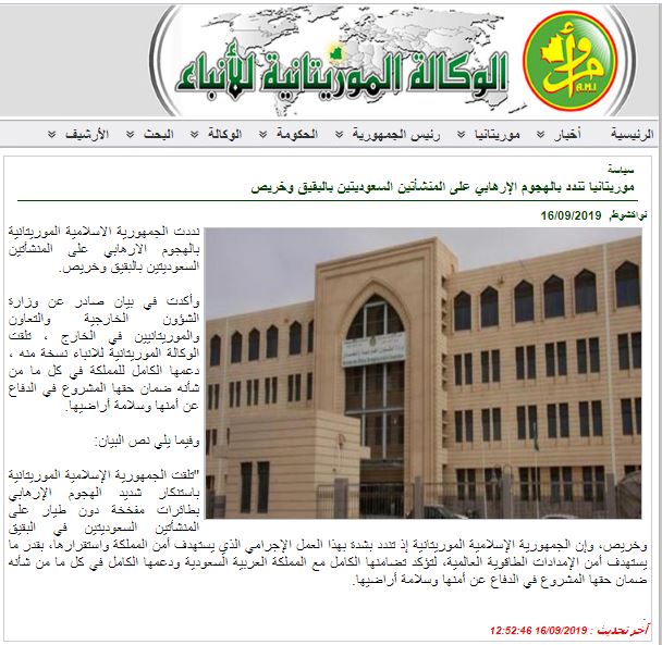 "تلقت الجمهورية الإسلامية الموريتانية، باستنكار شديد، أنباء الهجوم الإرهابي، بطائرات مفخخة دون طيار، على معمل للغاز الطبيعي بحقل الشيبة في شرق المملكة العربية السعودية.