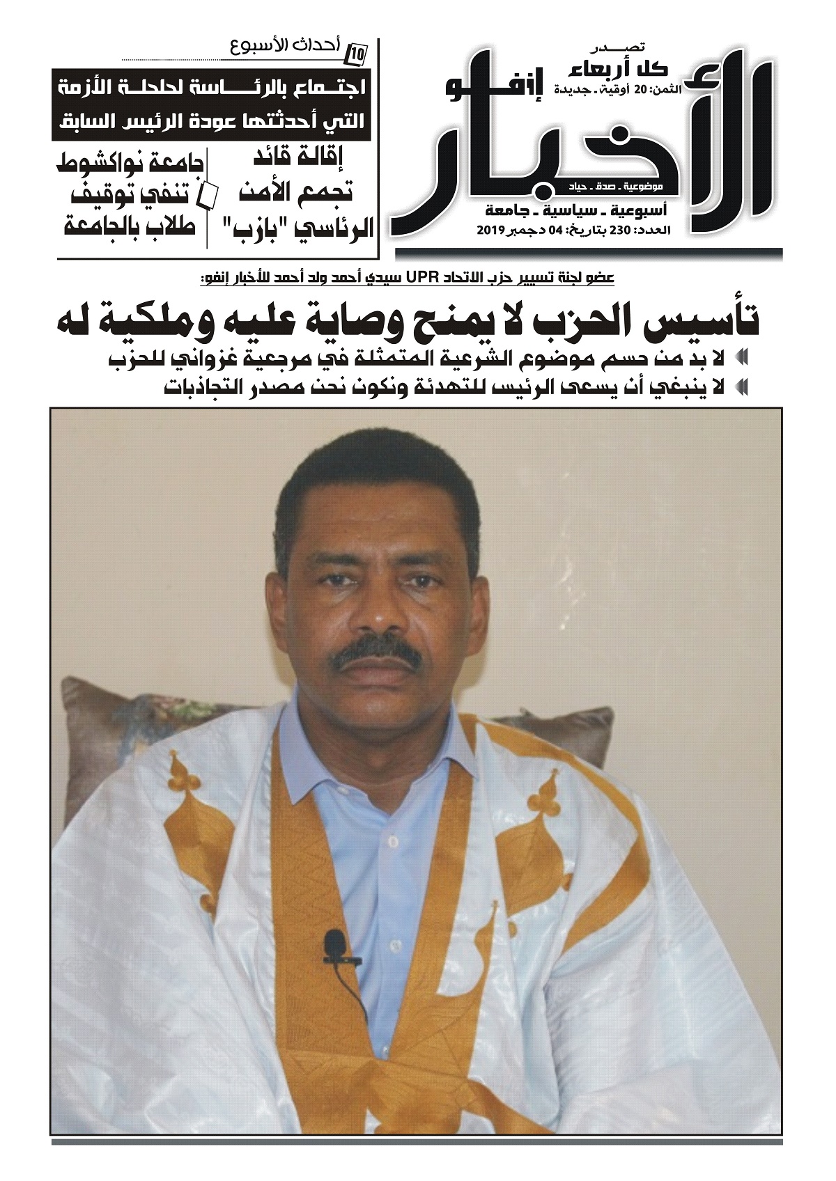 وتحدث ولد أحمد في المقابلة التي تنشر لاحقا عن التطورات الأخيرة داخل اللجنة، وعن المرجعية، وعن موقفه من الطعن في شرعية اللجنة، وعن توقعاته لتاريخ استئناف المؤتمر المعلق منذ الثاني من مارس الماضي، وعن علاقة الرئيس السابق محمد ولد عبد العزيز بالحزب.