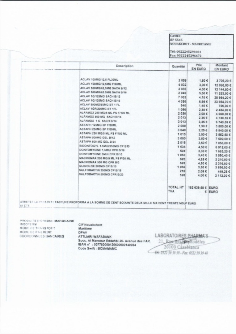 يأتي تجاوز نسبة الربح المحددة قانونيا في وقت تظهر فاتورة أدوية باسم شركة CAMEC موقعة من طرف مختبرات LABORATOIRES PHARMA في مدينة الدار البيضاء بالمملكة المغربية، أن التكاليف تتضمن نقل الأدوية حتى إيصالها ميناء نواكشوط.