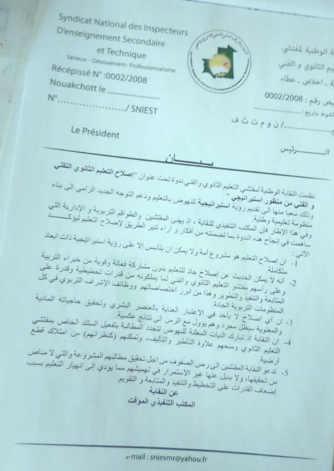 الأخبار (نواكشوط) ـ قالت النقابة الوطنية لمفتشي التعليم الثانوي إن "أي إصلاح لا يأخذ في الاعتبار العناية بالعنصر البشري وتحقيق حاجياته المادية والمعنوية سيظل مجرد وهم يؤول مع الزمن إلى نتائج عكسية".