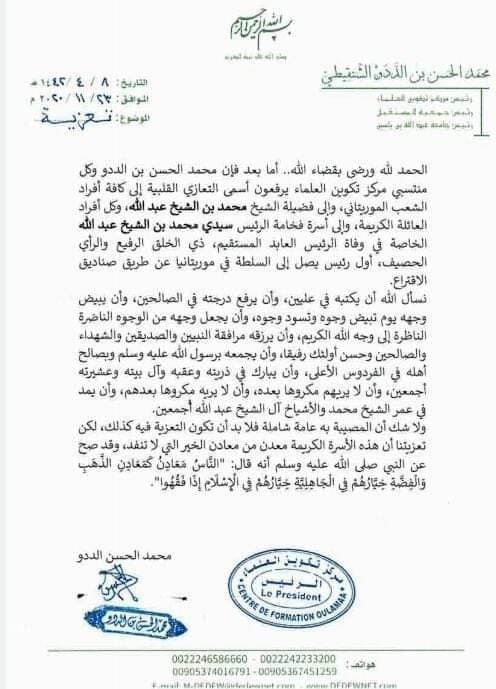 الأخبار (نواكشوط) تقدم العلامة الشيخ محمد الحسن الددو، بتعزية في وفاة الرئيس الموريتاني الأسبق سيدي محمد ولد الشيخ عبد الله.