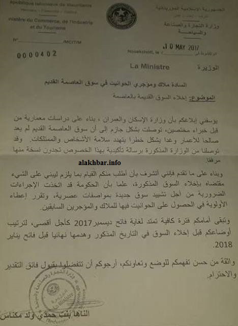 وجاء في الرسالة الموقعة بتاريخ 10 مايو الجاري، أن الفترة المتبقية أمام التجار والممتدة إلى غاية 1 ديسمبر، كافية لترتيب أوضاعهم قبل إخلاء السوق في التاريخ المذكور.