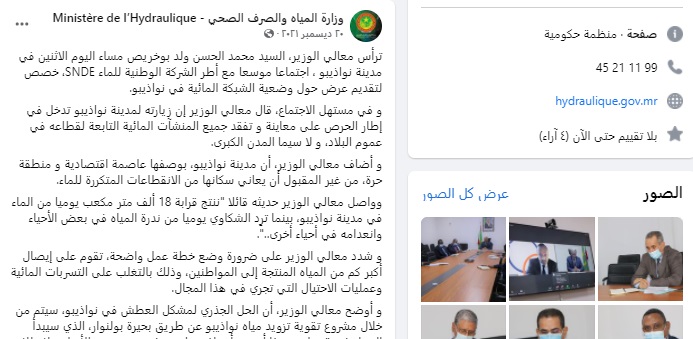 وحضر الاجتماع أطر الشركة الوطنية للماء SNDE، وخصص لتقديم عرض حول وضعية الشبكة المائية في نواذيبو.