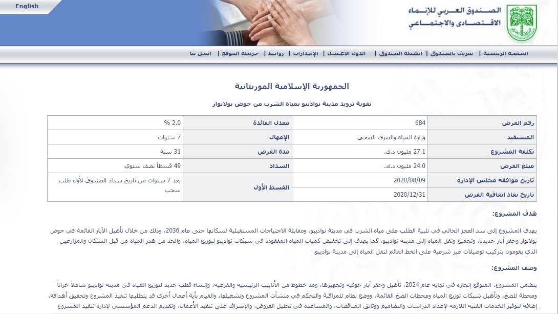 وصادقت الحكومة الموريتانية على اتفاقية هذا القرض خلال اجتماعها يوم الأربعاء 23 سبتمبر 2020، وأحالتها إلى البرلمان حيث صادق عليها يوم 09 نوفمبر 2020، وفي يوم 31 ديسمبر دخل القرض حيز النفاذ على مستوى الصندوق العربي للإنماء الاقتصادي والاجتماعي، وهو اليوم ذاته الذي عينت فيه وزارة المياه منسقا للمشروع.