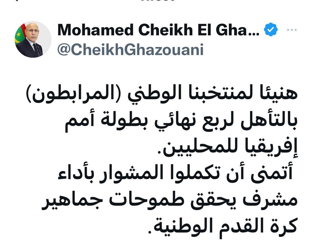 وقال ولد الغزواني في تغريدة نشرها على "توتير" إنه يتمنى أن يكمل المنتخب "المشوار بأداء مشرف يحقق طموحات جماهير كرة القدم الوطنية".