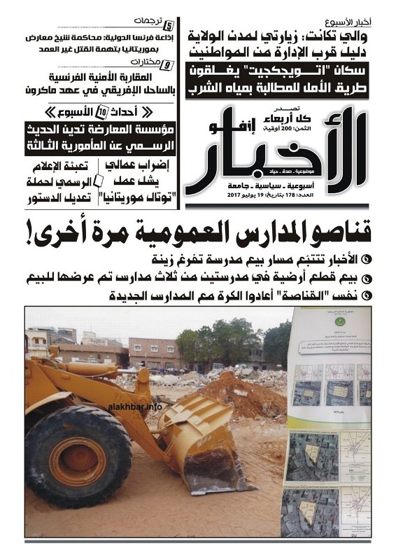 الأخبار (نواكشوط) – تناولت صحيفة الأخبار إنفو في عددها اليوم الأربعاء 19 – 07 – 2017 ما وصفته بعودة قناصي المدارس العمومية للكرة مجددا، من خلال الدفعة الجديدة من المدارس التي باعتها الحكومة العام الماضي، وعرفت عرض ثلاث مدارس و19 قطعة أرضية بيعت منها 7 قطع.