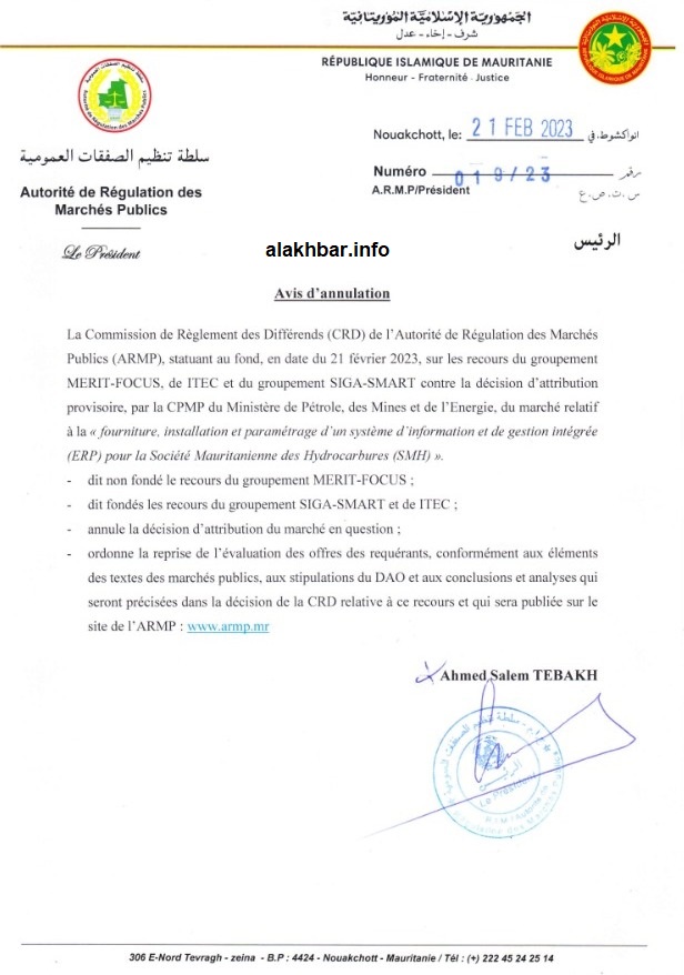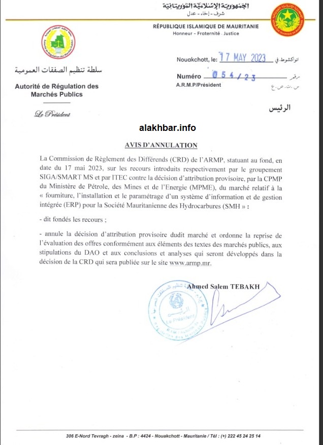 الأخبار (نواكشوط) – ألغت سلطة تنظيم الصفقات في موريتانيا وللمرة الثانية خلال أقل من ثلاثة أشهر قرار لجنة الصفقات بقطاع البترول والطاقة والمعادن منح صفقة عمومية متعلقة بإقامة نظام معلوماتي مندمج ومتكامل لصالح الشركة الموريتانية للمحروقات، وهي الصفقة المتعثرة منذ نحو عامين.