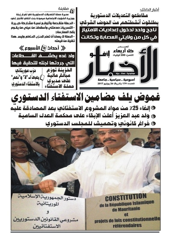 الأخبار (نواكشوط) – يلف الغموض مضامين الاستفتاء الشعبي الذي تنوي الحكومة تنظيمه يوم 05 أغسطس المقبل، والذي افتتحت حملته الدعائية ليل الجمعة الماضية، وذلك بفعل عدم نشر مضامين هذه التعديلات عبر وسائل الإعلام، إضافة للتغيير الذي طالها رغم صدورها في مرسوم يوم 30 مارس 2017، حيث طال الإلغاء والحذف 25% من مواد مشروع القانون الاستفتائي رغم مصادقة الحكومة عليه.