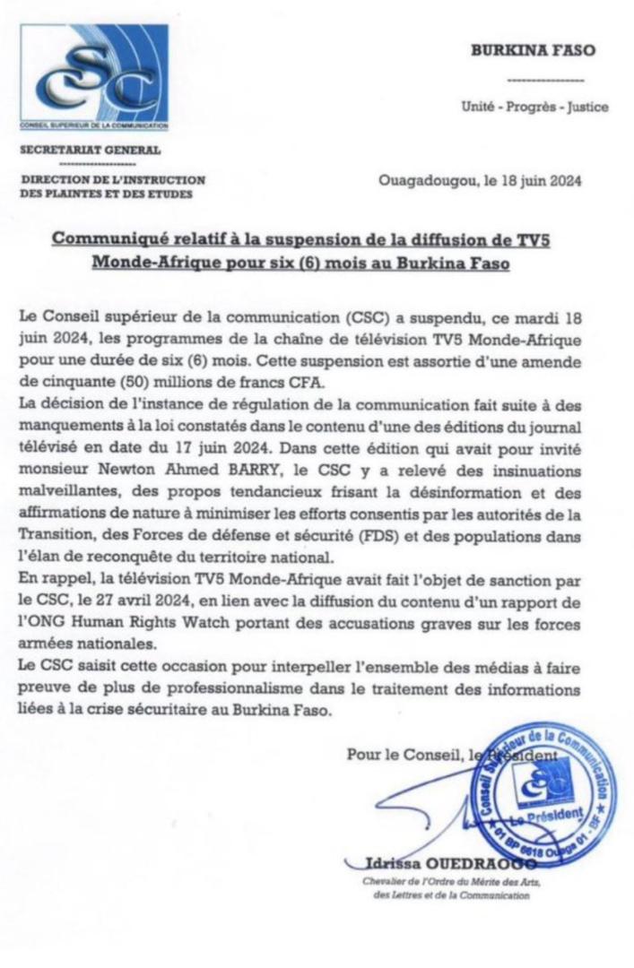 الأخبار (واغادوغو) - علق المجلس الأعلى للاتصال في بوركينا فاسو عمل قناة "تي في5 موند" الناطقة بالفرنسية لمدة 6 أشهر، وغرمها مبلغ 50 مليون فرنك إفريقي، حوالي 76 ألف أورو.