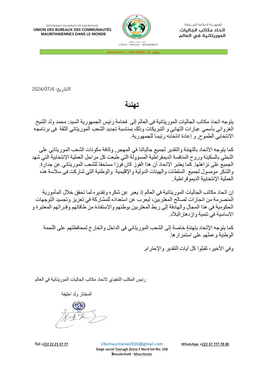يتوجه اتحاد مكاتب الجاليات الموريتانية فى العالم إلى فخامة رئيس الجمهورية السيد: محمد ولد الشيخ الغزواني بأسمي عبارات التهاني و التبريكات وذلك بمناسبة تجديد الشعب الموريتاني الثقة فى برنامجه الانتخابي الطموح, و إعادة انتخابه رئيسا للجمهورية.
