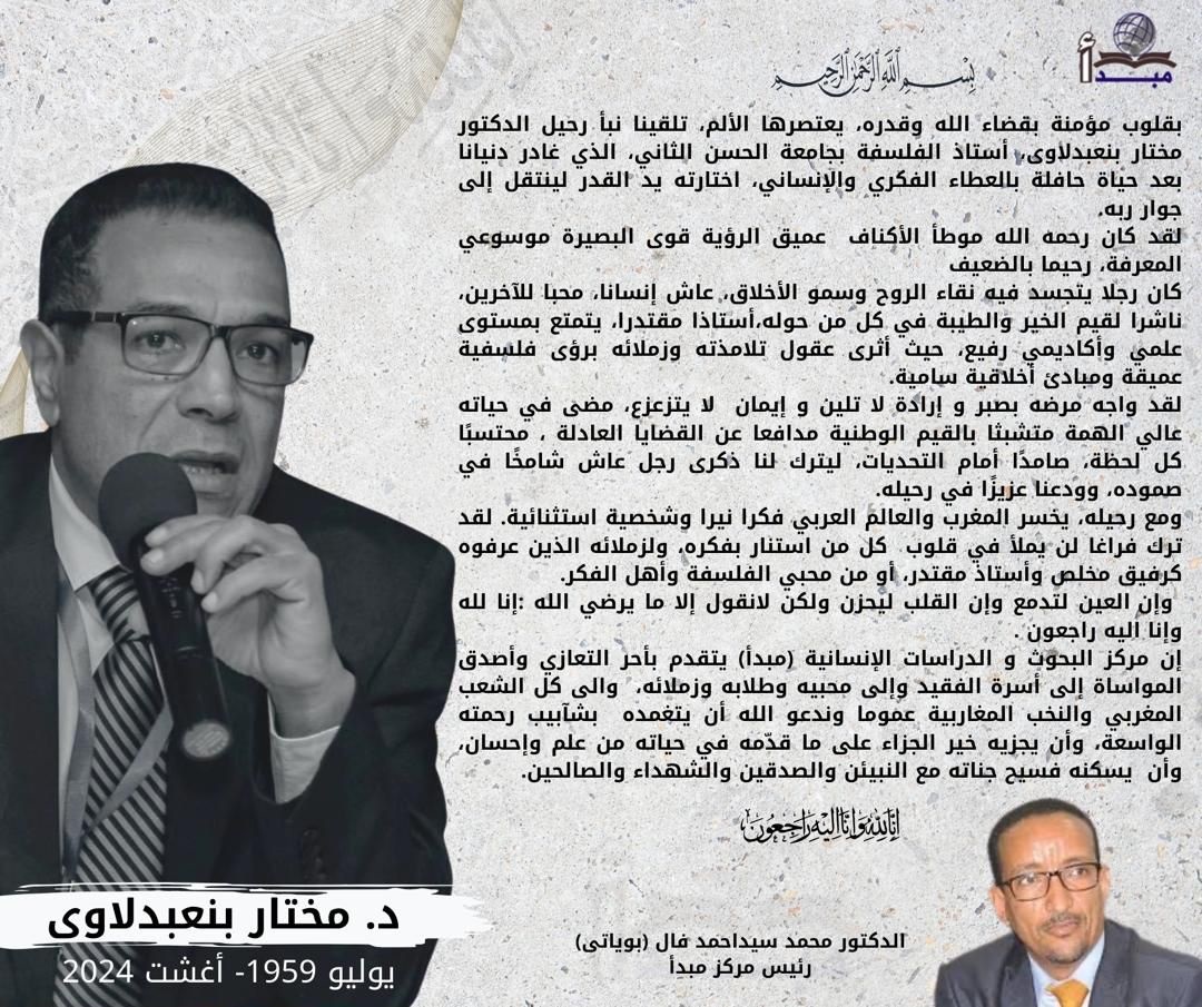 بقلوب مؤمنة بقضاء الله وقدره، يعتصرها الألم، تلقينا نبأ رحيل الدكتور مختار بنعبدلاوى، أستاذ الفلسفة بجامعة الحسن الثاني، الذي غادر دنيانا بعد حياة حافلة بالعطاء الفكري والإنساني، اختارته يد القدر لينتقل إلى جوار ربه.