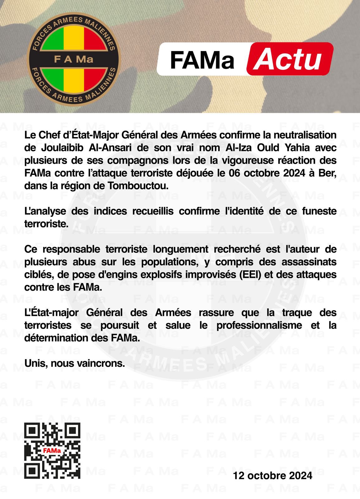 وتحدث البيان عن تعرض بلدة "بير" لهجمات مسلحة يومي 8 و9 من هذا الشهر، موضحا أن القوات المسلحة المالية تصدت لها.