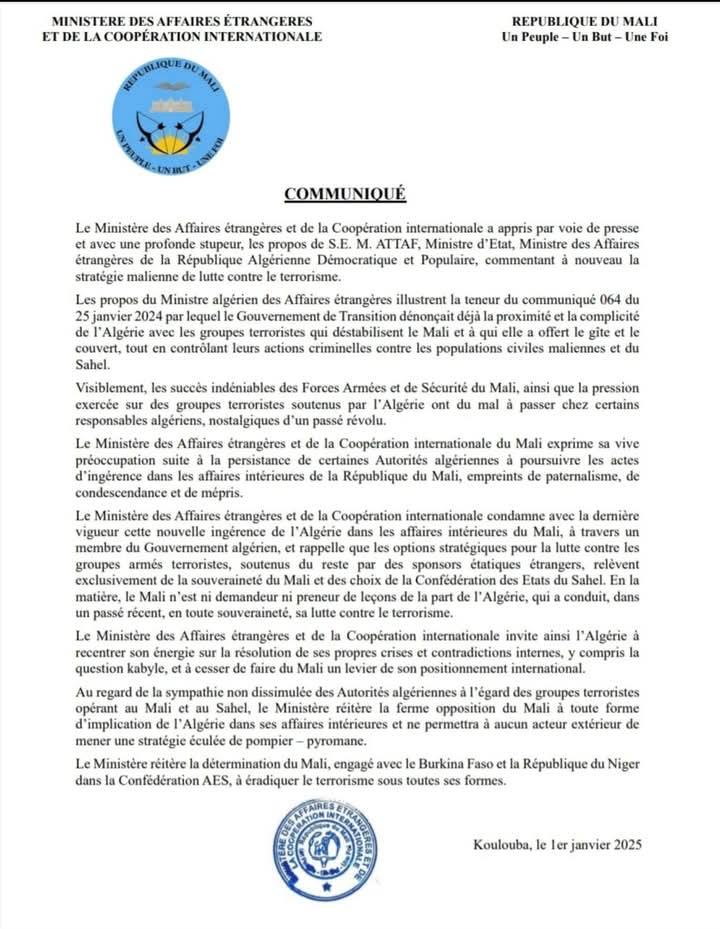الأخبار (باماكو) - نددت الحكومة المالية بـ"تدخل الجزائر في شؤونها الداخلية"، ودعتها إلى "التركيز على أزماتها الداخلية، بما في ذلك قضية القبائل، والتوقف عن استغلال مالي كأداة لتحقيق أهداف سياسية خارجية".