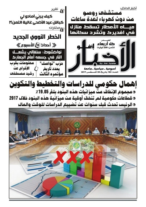 وفي وزارة الشؤون الإسلامية والتعليم الأصلي بلغت ميزانية إدارة البرمجة والإحصاء والتعاون 10.597.000، لم تنفق منها أي أوقية طيلة الأشهر الماضية من 2017.