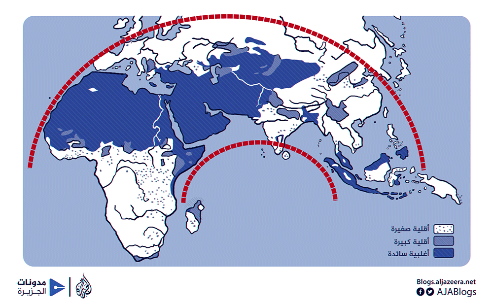 ربما يكون عالم الجغرافيا السياسية المصري الراحل جمال حمدان، والمفكر السياسي التركي أحمد داود أوغلو، هما الوحيدين - من بين المفكرين المسلمين المعاصرين - اللذين قدما رؤية متماسكة للجغرافيا السياسية الإسلامية. ففي كتابه (العالم الإسلامي المعاصر) وجد جمال حمدان أن العالم الإسلامي في تشكله الجغرافي هلالٌ "يتألف من قلب وجناحين" (الخريطة 1)، وأن هذا الهلال / الطير موزَّع ما بين جنوب آسيا وشمال أفريقيا. فــ"دار الإسلام في أفريقيا تتركز في الدرجة الأولى في نصفها الشمالي، بينما تقع في آسيا في نصفها الجنوبي".
