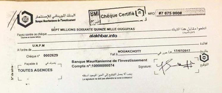 ونشرت صحيفة الأخبار إنفو في عددها اليوم الأربعاء 22 – 11 – 2017 صور وأرقام شيكات تعود "للبنك الموريتاني للاستثمار BMI" المملوك لرجل الأعمال ولد محمد محمود تم عبرها دفع مساهمات عدة اتحاديات، وهو يرفع عنها المنع من التصويت في الجمعية العامة لاتحاد أرباب العمل.