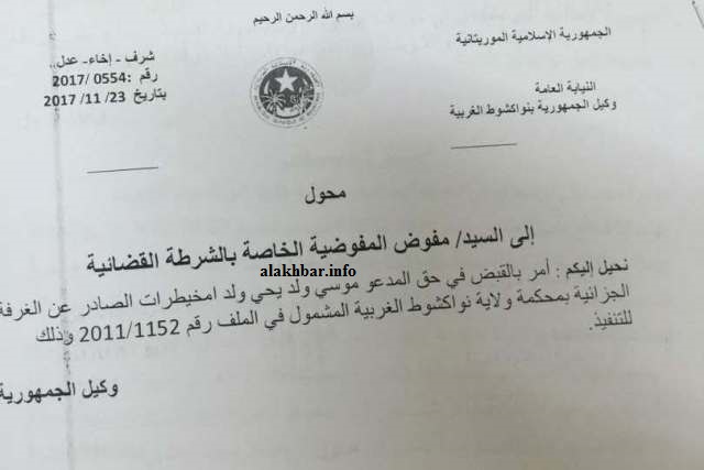 وعطل أمر القبض على ولد امخيطيرات الصادر يوم الخميس 23 نوفمبر الجاري ساعات بعد إصداره.