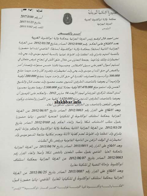 الأخبار (نواكشوط) ـ أكدت مصادر الأخبار أن أوامر عليا عطلت أمرا قضائيا صادرا عن وكيل الجمهورية بولاية نواكشوط الغربية بالقبض على موسى ولد يحيى ولد امخيطيرات المدان التحايل.